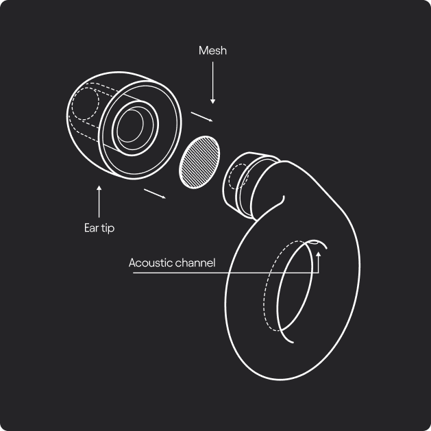 Combining a cleverly engineered acoustic channel and mesh filter, Loop Engage allows low and mid frequencies to pass through while higher frequencies attenuate, taking the edge off while keeping speech sounding natural.